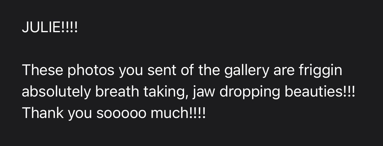 Julie is an incredible photographer and just as fabulous human! She made my entire boudoir shoot so soo fun. Her expert posing tips helped me look and feel my best, and the results were more than I could have hoped for. 10/10 recommend.